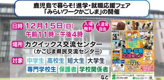 鹿児島で暮らそ!進学・就職応援フェア「みらいワークかごしま」の開催 ほか