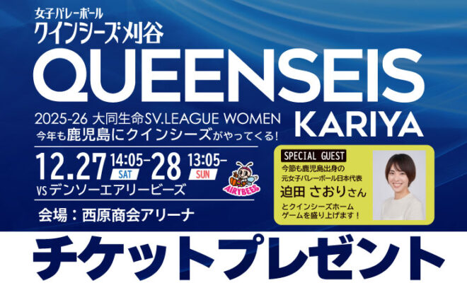 12月27日、28日鹿児島市の西原商会アリーナで大同生命SVリーグ クインシーズ刈谷 対 デンソーエアリービーズの試合が行われます。日本トップレベルの選手たちが繰り広げる、スピードと迫力の攻防戦。観戦チケットをプレゼント。…