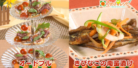 うなぎを使っておもてなしメニューの「オードブル」と「きびなごの南蛮漬け」を作ります。…