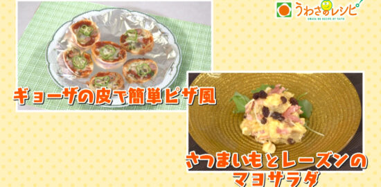 「ギョーザの皮で簡単ピザ風」と「さつまいもとレーズンのマヨサラダ」