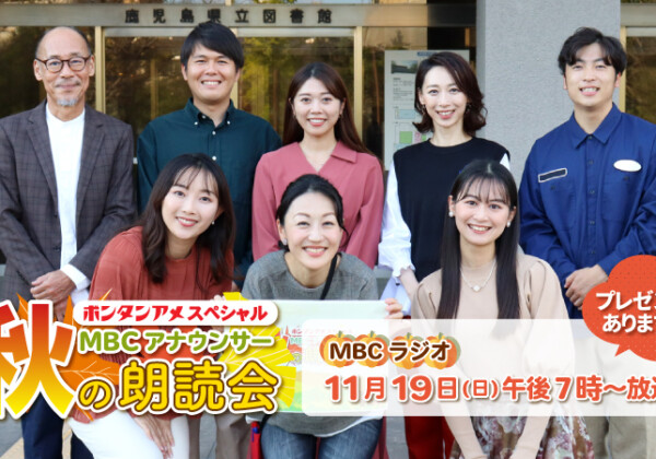 11月19日(日)19:00~20:00放送11月5日(日)に鹿児島県立図書館で行われた「ボンタンアメ・スペシャル MBCアナウンサー秋の朗読会」の模様をお届けします。プレゼント番組内で発表されるキ…