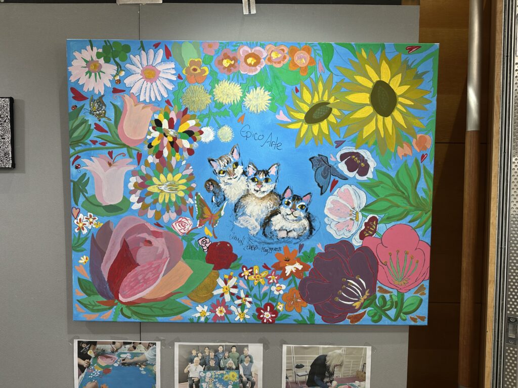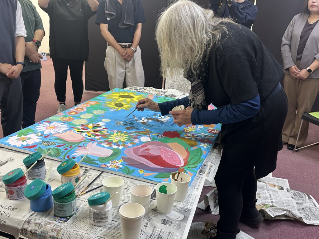 絵画展前日にはフランス在住プロの画家、「ジャネット・ルール画伯」をお招きしハンディを持たれた利用者の方々と一緒に絵を描く交流会を行い、プロの画家と共同で一枚の絵画作品の制作をする楽しい時間になりました。