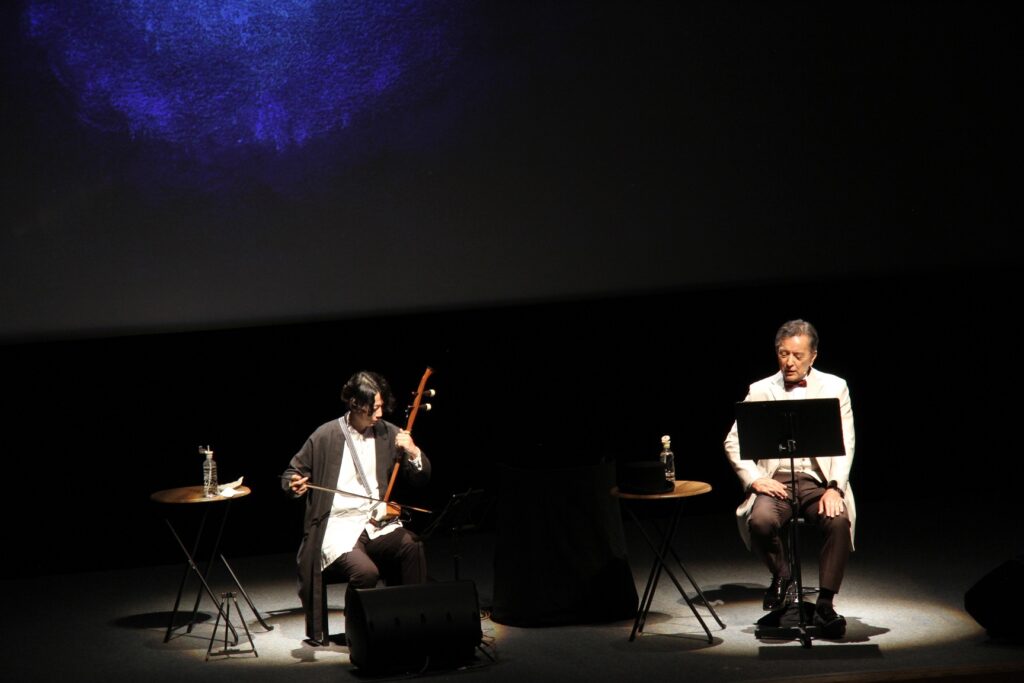 公演では、宇宙と愛をテーマにした壮大な物語(原作「永遠という名の一瞬」著:十和音 響)を、榎木さんの朗読に合わせて里地帰さんが和胡を演奏。やわらかく美しい音色とともに、原作本の葉祥明さん の挿絵がバックスクリーンに映し出されて、物語の世界を演出しました。