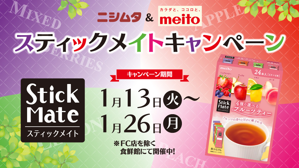 ニシムタでは、FC店除く食鮮館において「ニシムタ×meito スティックメイトキャンペーン」を開催中!
