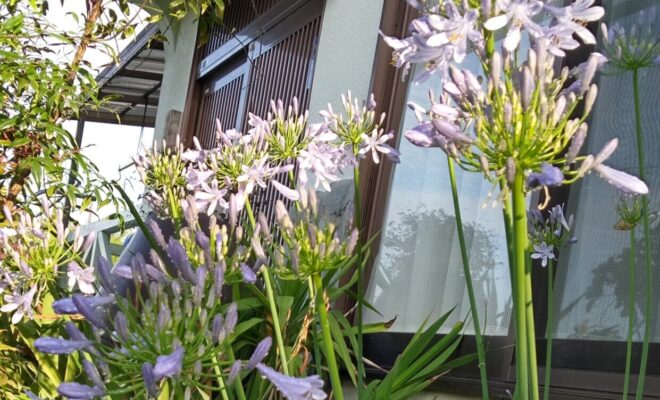 RN.伊佐の花嫁 さん雨上がりの朝日を浴びた今朝のアガパンサスです。今年は数えたら22本花がついていました。爽やかな水色は青空を呼んでいるようです。お洗濯日和りになりますように。…