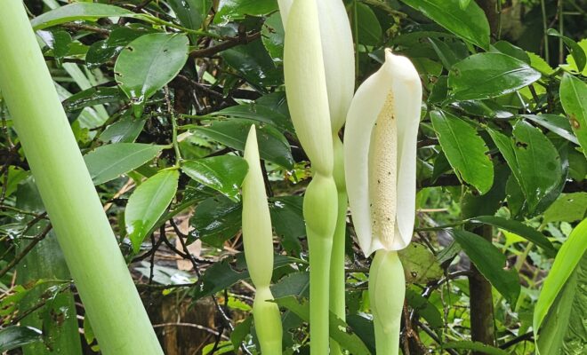 RN. あご肉子 さん先日、友達の実家に行ったら「トイモガラ」の花が咲いてました。最初はカラーかと思いましたが、葉っぱがトイモガラです。初めて見ました。聞くと何十年かに1回咲くとか?愛知に住んでる彼女も初めて見たそうです。えっちゃ…