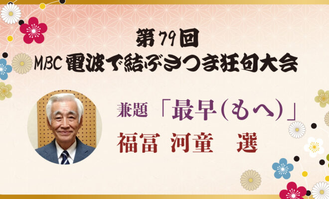 ■講評 福冨 河童 先生(ラジオ「さつま狂句」選者)今回は「最早(もへ)」の課題に、たくさんの素晴らしい作品をいただきまして、本当にありがとうございます。選句に頭が、びんたが、脳がまっきろそうな感じがしました。いず…