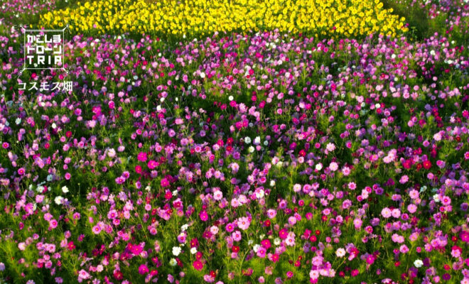 今回の舞台は、鹿屋市串良町岡崎。 地域の方々によって整備されたコスモス畑では、ピンクや白のコスモスに囲まれるように黄色いひまわりが咲き、夏と秋の景色を同時に楽しむことができます。
