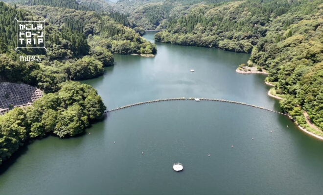 今回の舞台は霧島市溝辺町有川の竹山ダム。県道40号線から竹山集落を目指し網掛川水系宇曽の木川に沿って上ると現れるロックフィルダム。展望所や橋周辺の水辺はバス釣り愛好家から人気のスポット。ダム入り口から奥まで一気に空から眺める旅へと…