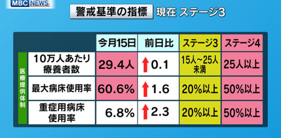 鹿児島県内で新型コロナウイルスの感染の拡大が続く中、県の警戒基準の指標のうち、医療機関の病…