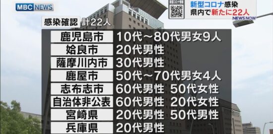 鹿児島県内では5日、新型コロナウイルスの感染者が新たに22人発表されました。感染が…