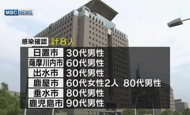 鹿児島県内では29日、新型コロナウイルスの感染者が新たに8人発表されました。感染が確認されたのは、日置市の30代男性、薩摩川内市の60代男性、出水市の30代男性、鹿屋市の60代女性2人と80代男性、垂水市の80代男性、鹿児…