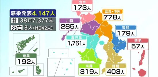 鹿児島県内では7日、新型コロナウイルスの感染者が新たに4147人と、3人の死亡が発表されま…
