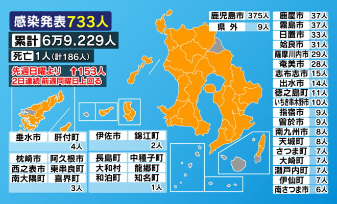 鹿児島県内では8日、新型コロナウイルスの感染者が新たに733人発表されました。(内訳)鹿児島市375人鹿屋市37人霧島市37人日置市33人姶良市31人薩摩川内市29人奄美市28人志布志市15人出水市14人徳之島町1…