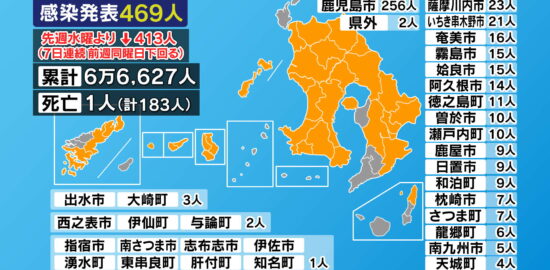 鹿児島県内では4日、新たに新型コロナの感染者469人と1人の死亡が発表されました。…