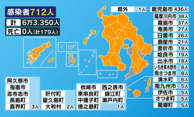 鹿児島県内では28日、新型コロナウイルスの感染者が新たに712人発表されました。10日ぶりに前の週の同じ曜日を下回ったものの、依然、多い状態が続いています。(内訳)鹿児島市436人薩摩川内市38人霧島市37人奄美市…