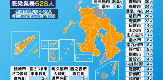 新型コロナウイルスの感染者は鹿児島県内で15日新たに628人発表されました。…