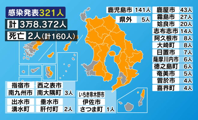 鹿児島県内では20日、新型コロナの感染者が新たに321人と2人の死亡が発表されました。鹿児島市141人鹿屋市43人霧島市27人姶良市20人志布志市14人阿久根市8人大崎町8人日置市7人薩摩川内市6人徳之島町6人奄美…