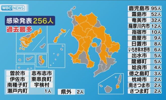 鹿児島県内では19日、新型コロナウイルスの感染者が新たに256人発表されました。去年8月19日の251人を上回り、過去最多です。感染が確認されたのは、鹿児島市95人、霧島市52人、奄美市32人、薩摩川内市12人、指宿市10…