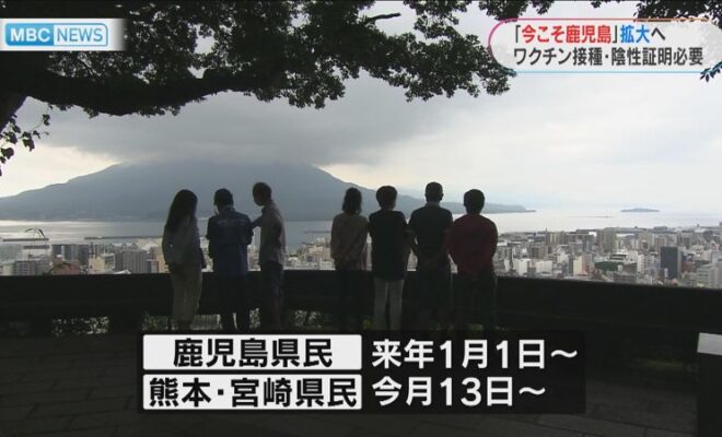 鹿児島県が新型コロナで打撃を受けた観光・旅行業者支援として行っている県内旅行補助「今こそ鹿児島の旅」。その対象が県民だけでなく、熊本・宮崎県民にも拡大され、鹿児島県民が利用する場合でも、ワクチン接種済みや陰性などの証明が必要になり…