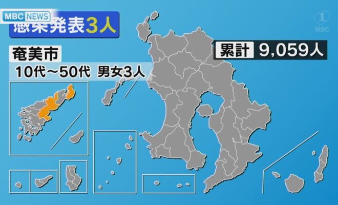 新型コロナウイルスの感染者は鹿児島県内で2日、新たに3人発表されました。2日、新たに発表されたのは奄美市の10代女性と50代女性、40代男性の合わせて3人です。県内の感染者は累計で9059人となりました。1日時点で…
