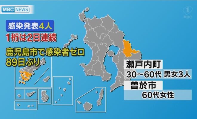 鹿児島県内では21日、新型コロナウイルスの新たな感染者が4人発表されました。また、鹿児島市で感染者は確認されませんでした。鹿児島市で感染者ゼロは89日ぶりです。新たに確認された感染者は、瀬戸内町の30代から60代の男女3人…