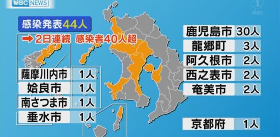 鹿児島県内では4日、新型コロナウイルスの感染者が新たに44人発表され、2日連続で40人を超…