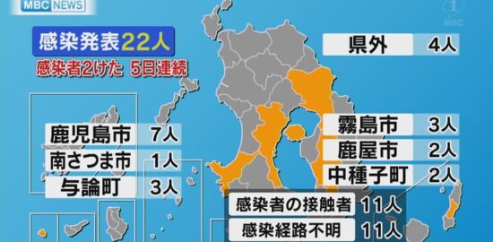 新型コロナウイルスの感染者が鹿児島県内で新たに22人発表され、5日連続で2桁となりました。…