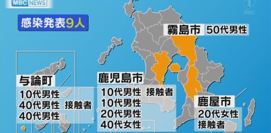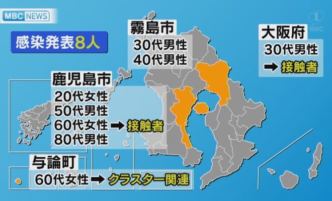 鹿児島県内では24日、新型コロナウイルスの感染者が新たに8人発表されました。◆新型コロナ 新規感染者8人・鹿児島市の20代から80代の男女4人・霧島市の30代と40代の男性・与論町の60代女性・大阪府に住む30代男性…