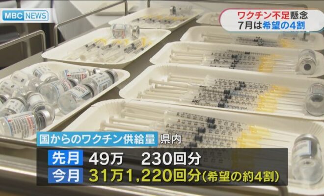 国から鹿児島県に配分される新型コロナワクチンの7月分の供給量が、希望の4割にとどまる見込みであることが分かりました。MBCが7日に県内全ての市町村に取材したところ、16の市と町で「8月の接種分が不足する可能性がある」ことが分かりま…