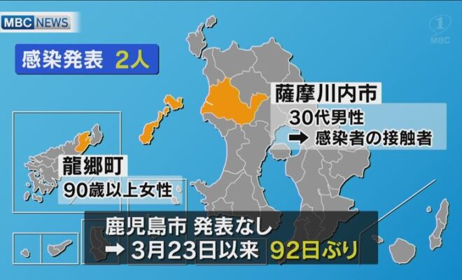 鹿児島県内では23日、新型コロナウイルスの感染者が新たに2人発表されました。ただ、鹿児島市での感染者の発表は92日ぶりにありませんでした。感染が確認されたのは、薩摩川内市の30代男性と龍郷町の90歳以上の女性のあわせて2人…