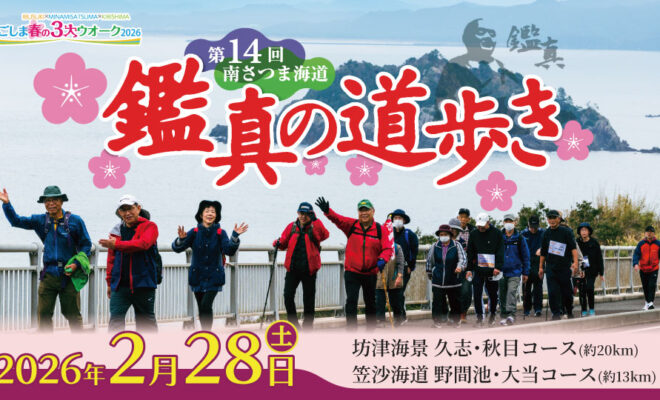 日程2026年2月28日(土)コース①坊津海景 久志・秋目コース(約20㎞) 600名(先着順) 久志地区公民館グラウンド スタート/ゴール 【受付】午前7時30分~【開会式】午前8時15分~【出発】午前8時30分~②笠沙海道 野…