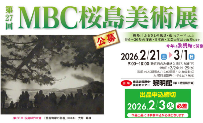 「桜島」「ふるさとの風景・花」をテーマにした洋画・日本画・工芸の作品を公募します。審査会を経て、入賞・入選の作品を2026年2月21日~3月1日の期間中、黎明館の会場に展示し、多くの皆様にご鑑賞いただきます。実施要項(P…
