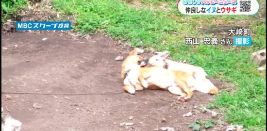 民家の庭で飼われているイヌのリュウ(オス・8歳)に近づいてきたのはウサギ。2匹は互いをじっ…