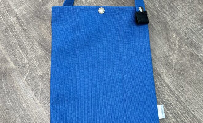 ほぼA4サイズの縦型ワンハンドルバッグです。 持ち手が着脱可能な片側ボタン止めになっているので他のバッグの持ち手につけて使うこともできます。軽く糊がついた、弱撥水タイプの帆布製で、さりげない「suzume」のタグ…