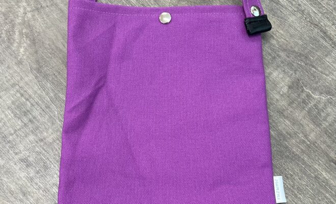 ほぼA4サイズの縦型ワンハンドルバッグです。 持ち手が着脱可能な片側ボタン止めになっているので他のバッグの持ち手につけて使うこともできます。軽く糊がついた、弱撥水タイプの帆布製で、さりげない「suzume」のタグ…