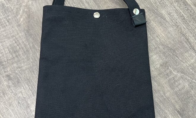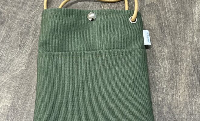 ほぼA4サイズの縦型ワンハンドルバッグです。 持ち手が着脱可能な片側ボタン止めになっているので他のバッグの持ち手につけて使うこともできます。軽く糊がついた、弱撥水タイプの帆布製で、さりげない「suzume」のタグ…