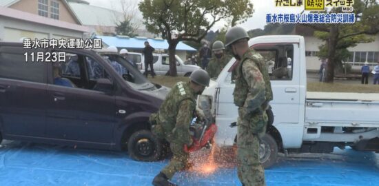 11月23日。垂水市では桜島爆発総合防災訓練を行いました。訓練には消防・自衛隊・警察や国土交通省等が参加し、車両閉じ込めからの救助訓練や放置車両の移動などの訓練を行いました。