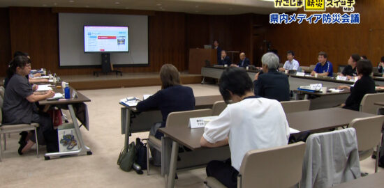 県内のケーブルテレビやコミュニティエフエムなどの代表や担当者が防災について意見を交わす。県…