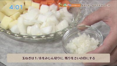 玉ねぎは、1/8をみじん切りに、残りをさいの目にする。