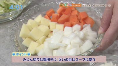 ※みじん切りは鶏団子に、さいの目はスープに使う。