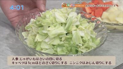 人参、じゃがいもはさいの目に切る。キャベツは1cmほどのざく切りにする。- 3