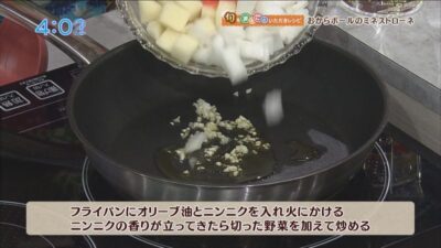 フライパンにオリーブ油とニンニクを入れ火にかける。ニンニクの香りが立ってきたら切った野菜を加えて炒める。