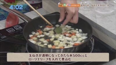 玉ねぎが透明になってきたら水500ccとローリエリーフを入れて煮込む。