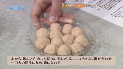 おから、鶏ミンチ、みじん切りの玉ねぎ、塩、こしょうをよく混ぜ合わせ、一口大の団子に丸め、鍋に入れる。