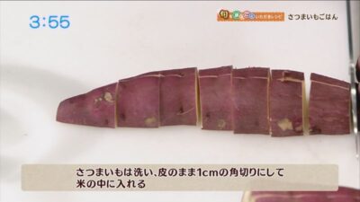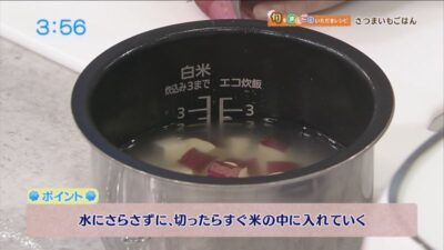 さつまいもは洗い、皮のまま1センチの角切りにして、米の中に入れる※水にさらさずに、切ったらすぐ米の中に入れていきます。