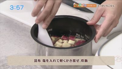 昆布、塩を入れて軽くかき混ぜ、炊飯。