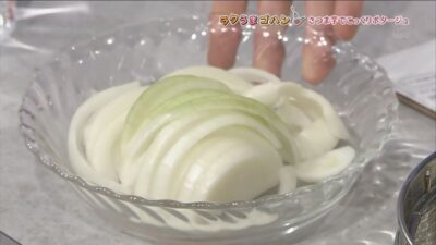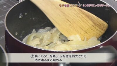 鍋にバターを熱し、玉ねぎを弱火で5分、透き通るまで炒めます。