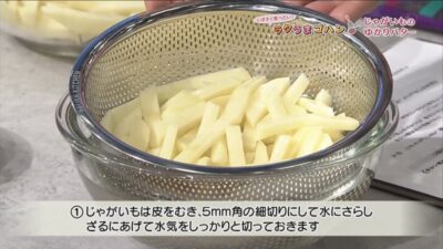 じゃがいもは皮をむき、5mm角の細切りにして水にさらし、ざるにあげて水気をしっかりと切っておきます。