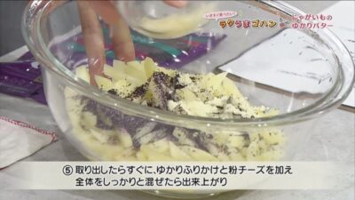 取り出したらすぐに、ゆかりふりかけと粉チーズを加え、全体をしっかりと混ぜたら出来上がり!